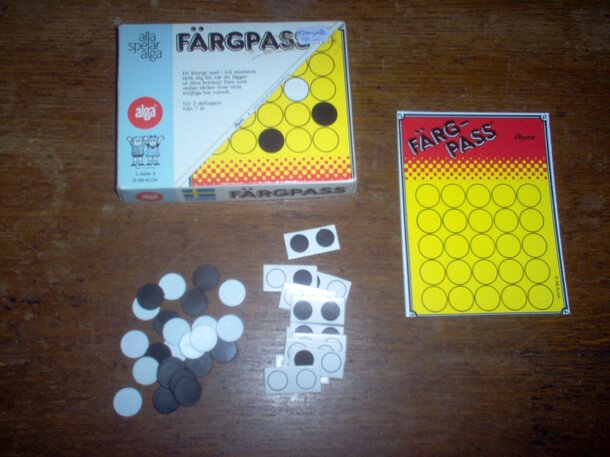 The playing board of Färgpass consists of a 5x5 grid. During the first phase of the game, the players take turns filling the grid with black and white chits, one in each space except one. In the second phase, the players take turns placing another type of chit that has a 1x2 shape, and that has two colored dots on it: white-white, white-black or...