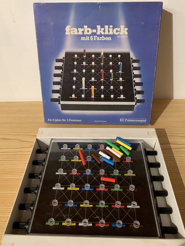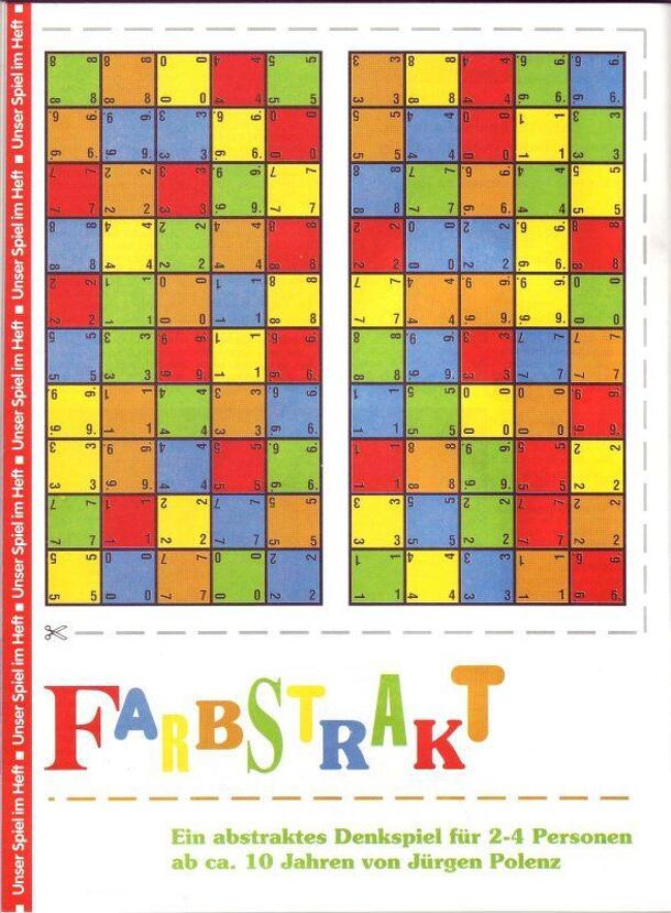 The game "Farbstrakt" was included in Spielbox 1/91 as part of the "Spiel im Heft/Game in the zine" series. The board consists of 2 halves of 5x10 grids, which must be layed together so that at least 2 spaces connect the two halves. The 100 spaces on the board are coloured in one of 5 different colours and show numbers from 0-9. 5 playing pieces in these 5...