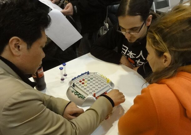 When bees are creating honeycomb, they connect their legs together to form a chain, called a festoon. In this game, players compete the be the first to form a festoon. Players take turns placing hexagonal bee tiles adjacent to the other tiles on the table one at a time. The first player who places four bees in a straight line wins. As players create...