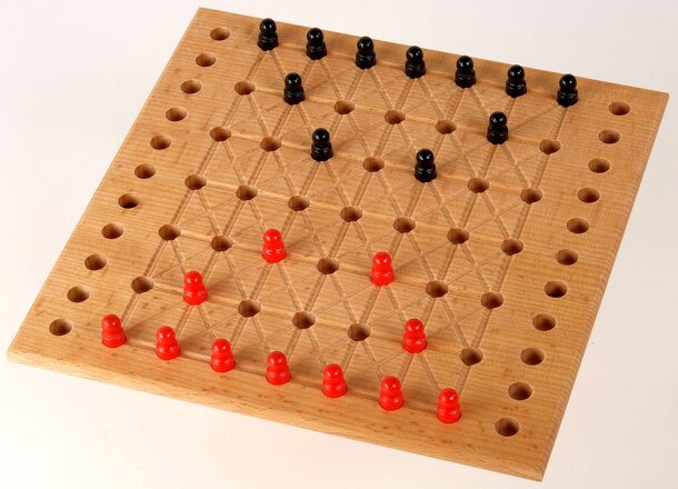 Played on a polar grid with variable numbers of positions on each circumference. One piece-type only (stones), each player starts with 27 stones, 8 placed at specific starting positions, 19 off board. Two game phases : placement and then movement. Play usually alternates between players. Custodian capture applies during each phase, successful capture...
