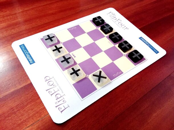 FlipFour is an innovative approach to creating a new four-in-a-row game with great game play, but using just 4 pieces per player (i.e. the absolute minimum number of pieces). MATERIALS 4 white FlipFlop pieces, 4 black FlipFlop pieces and a 5×5 board. FlipFlop pieces have a '+' on one side and a 'x' on the other. RULES Initial Setup The board starts empty....
