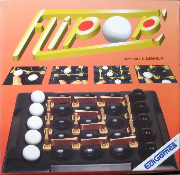 The Flipop board consists of a 5x5 grid of spaces. In each of the 16 intersections between four spaces, there is a post holding a door that can swing around so that it blocks access between any adjacent two spaces of the four spaces around it. Each player has five balls on his side of the board. The object is to move the balls across the board, at which...