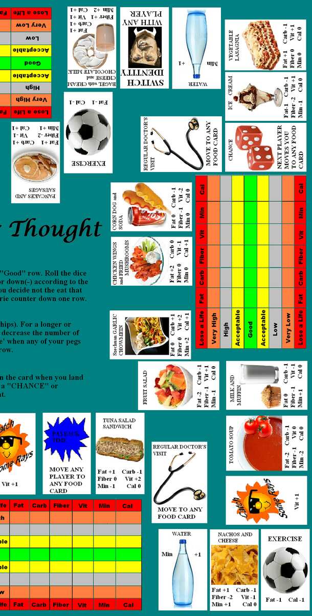 Food for thought is a nutrition themed board game. The emphasis is on eating a balanced diet exemplified by 6 food attributes of Fat, Carbohydrates, Fiber, Vitamins, Minerals and Calories. It is part chance (dice) and part strategy (players decide whether or not to 'eat' the food card they land on) based. The theme in general is also to introduce younger...