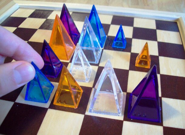 Folio is an Icehouse-based abstract strategy game for two players. The rules are simple, but the strategy can get mind-bending. It owes some rule ideas to the commercially available game Quarto (thus the name). To play you require one stack of pyramids from each of four colours plus one extra from each colour (with only two of these being of the same...