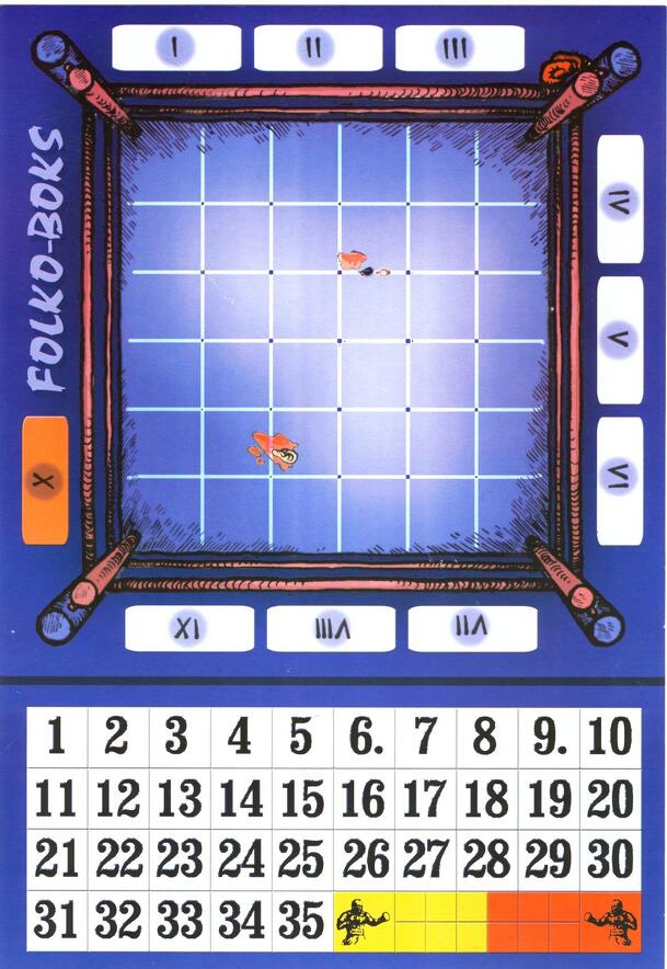 Folko-Boks is a boxing-themed abstract pure strategy game. The game lasts 10 rounds in a ring of 36 squares, randomly initialized with numbered chits. In each round, players move their boxers like a chess knight, removing the numbered marker from the square they left. The boxer who moves onto a higher numbered square wins that round. Being unable to move...
