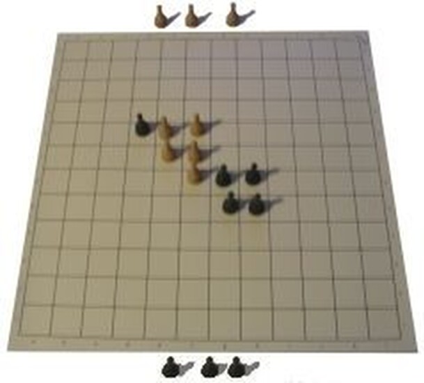 Once again the checker board provides the basis for a game, only this time the size grid required is 10x10. In 'Freeze' the movement of each playing piece is dependent upon its position on the board in relation to the other pieces. The object of the game is to prevent one's opponent from moving any of his pieces. Each of the players has ten cube-shaped...