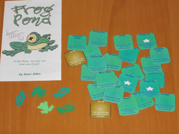 Frog Pond is an abstract, 2-player game with the theme of frogs on lily pads. The lily pad tiles are arranged in a grid, and each player has a frog token. On your turn, you may move your frog on space orthogonally, and you must slide one row or column of lily pads one space. (You may perform these actions in either order.) When two or more groups of lily...