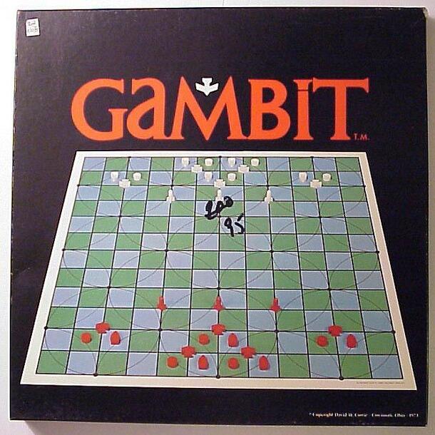 Gambit is an abstract strategy game in the trappings of a war game. Players use jets, ships, amphibious vehicles, and rockets to seize an enemy goal square or eliminate their opponent. The map for at least one printing is a bit of a curiosity. In it, the cover of the box shows a 10x10 board with alternating green and blue squares. The instructions note...
