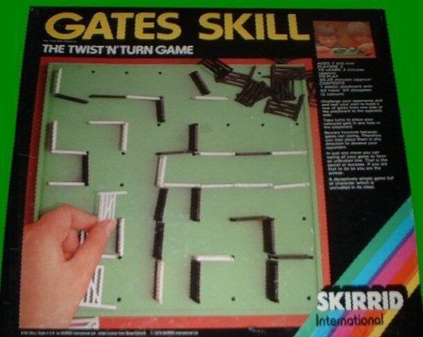Gates Skill is a connection game. The board is an 8x8 array of holes, and the pieces are gates - effectively a line between one hole and an orthogonally adjacent one, with one end attached to a hole, which it can rotate around. The object is to have an unbroken series of your gates connecting two opposite sides of the board. It's possible to capture...