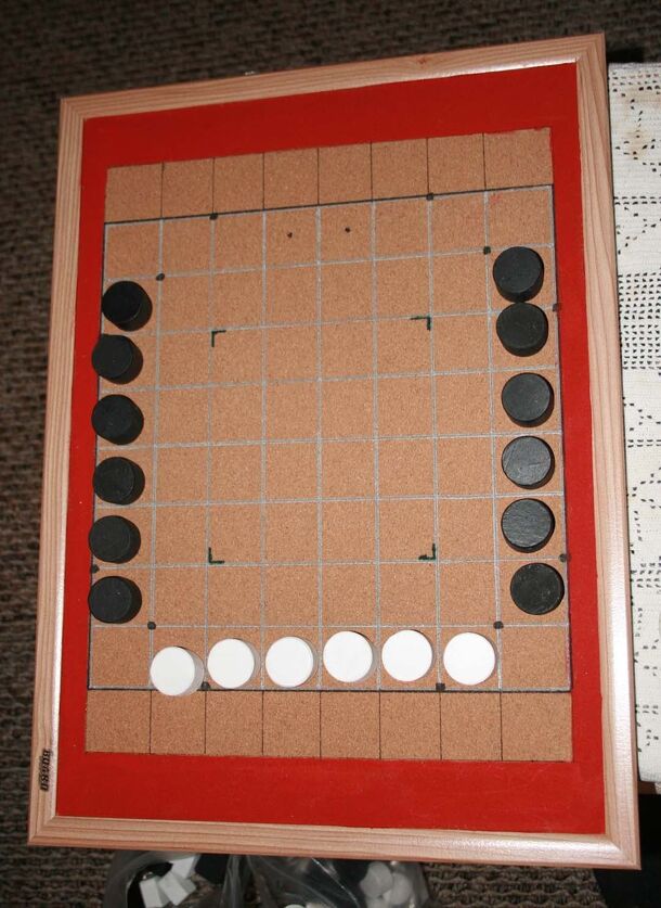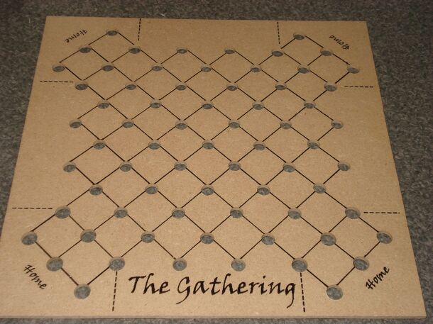 A Chinese checkers-like game where a player has to bring one of his stones to the opposite corner of the board. Stones move by going through special "gates" from one board cell to another. Once a stone goes through a "gate", the "gate" turns 90 degrees so it connects a different pair of board cells. A player can also win the game by leaving the opponent...