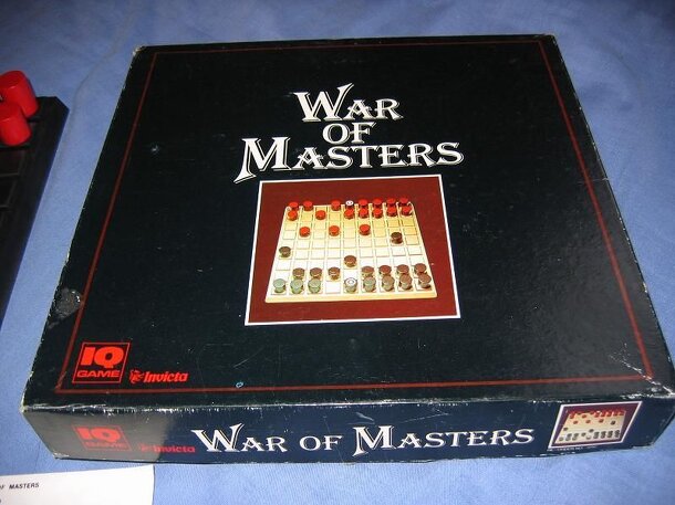 Simple Chess-style game played on a 9x9 board and using a single die. Each side has nine short cylinders, eight large cylinders and one "master" large cylinder. The object of the game is to capture your opponents MASTER.(That is a wooden token). You do this by rolling the dice and move your counters the given numbers of squares according to the movement...