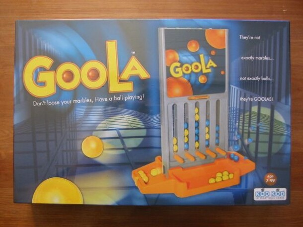 Goola is a advanced adaptation of "Connect Four" with some twists. Players alternately drop one of their twenty "Goola" beads into one of the five slots in the Goola Tower trying to form a line of 4 or 5 beads of their color in order to accumulate points (1 point for a line of 4 and 2 points for a line of 5). The twist here is that scoring only happens...
