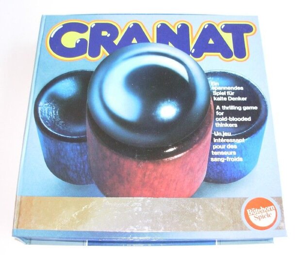 Granat (=garnet) is played on a 9 x 7.5 grid board and both players have an army of 14 pieces and 2 "Granat"-balls. Each wooden playing piece has a crater-shaped top, which enables to hold one of the metallic granat balls. Object of the game is to capture all opposing pieces. Normal pieces can move 1 grid, but pieces holding a granat ball can move as far...