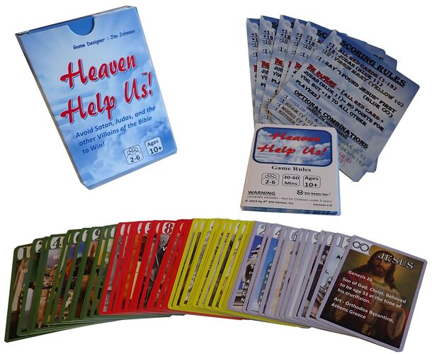 Heaven Help Us! - Family-Friendly Game with a Bible Theme. It's is a bible spin-off of the old card game Hearts with some new twists. The goal of the game is to be the player with the lowest score at the end of the game. Easy to learn, competitive, medium strategy card game. Ages 10+ Cards are beautiful pictures of artwork of the Apostles, Villains...