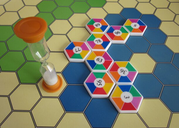 Hexomino is a logical game played on hex game board. The players place alternately six-colour plastic tiles on the board, so it matches at least two tiles on the board. Who can't place any tile onto the board, must draw three tiles. The player who first run out of tiles, is the winner. There is a more complex variant of the game, in that every player place...
