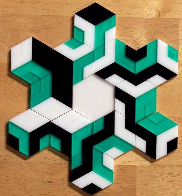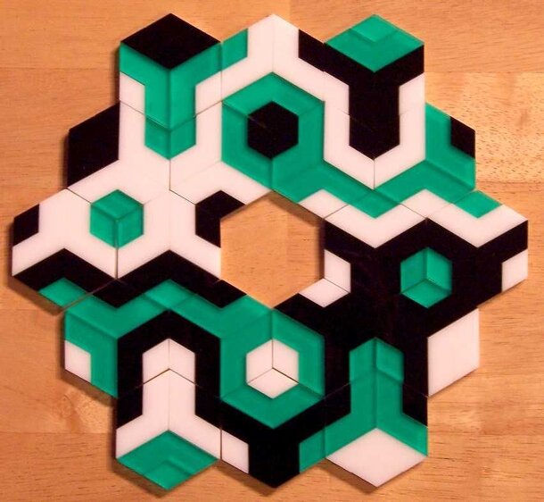 Hexmozaix is a set of 12 hexagonal tiles divided into 6 regions, 3 rhomboid regions at 3 alternating corners, and 3 chevron-shaped regions each enclosing a rhomboid. There is one tile for each possible way of coloring the regions with 3 colors such that each rhombus is a different color and each chevron is a different color (including reflections). There...