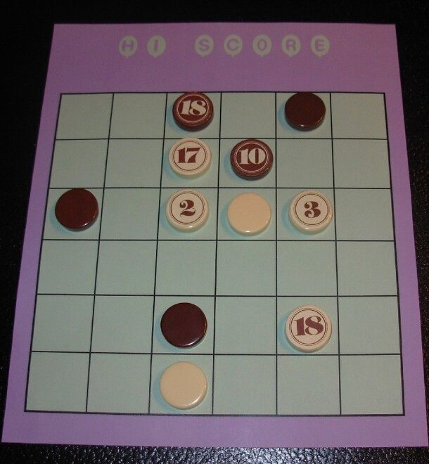 "Hi Score" was published in the German magazine Pöppel-Revue 5/86 as "Spiel im Heft". The board has 6x6 spaces and both players have 18 stones, numbered from 1-18 on the front side and empty on the back side. The game begins with an empty board. Each turn, a player places a stone on the board on the same row or column the last stone has been placed. Stones...