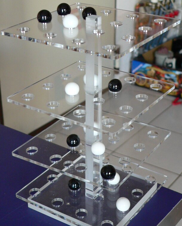 HI!Noon - Das Duell is a four-in-a-row game on a 4×4×4 cube. 32 black and 32 white balls are used. Once you get 4 in a row you can get one ball from the other colour. The player who gets most balls from the other colour wins. The rotation of the four playing surfaces is also part of the play action. The game was released at Essen 2009 by the author....