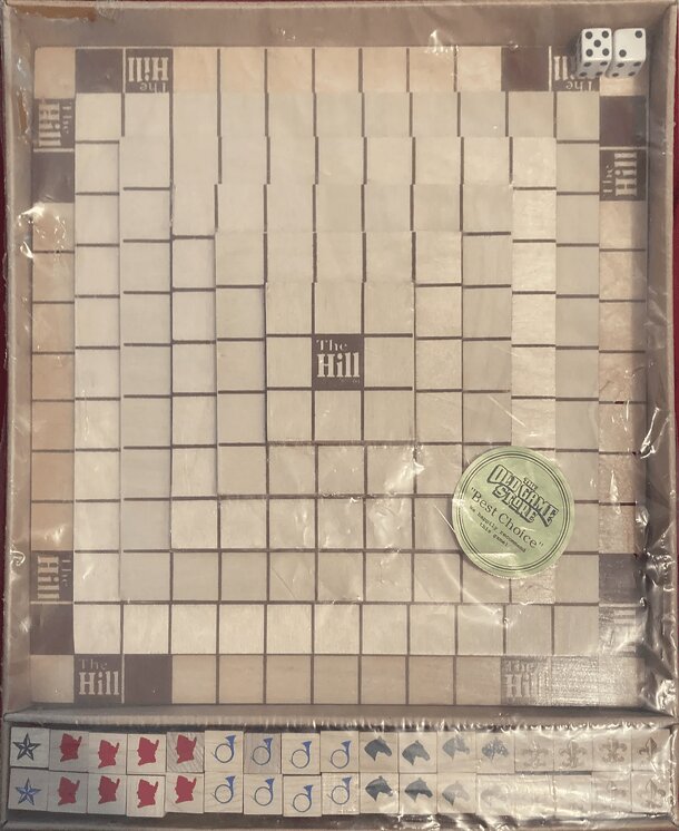 From GAMES Magazine: The grass always seems greener on the other side of this six-level hill, so everyone's going over the top to win by reaching four enemy bases there. Dice rolls determine movement. You can jump single enemies (except uphill) and flip them over to become yours. A piece landing on the summit becomes a Field Marshal, which cannot be jumped...