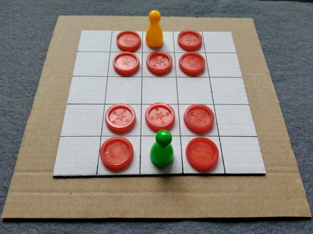 The game board shows 9 fields on which the game pieces are placed and moved. In the 2-person game, the game is played on the five central squares of the game board. Each player receives 6 discs in his color and tries to form a tower of three in his own color as quickly as possible. The active player places a piece on a square. The players take turns until...