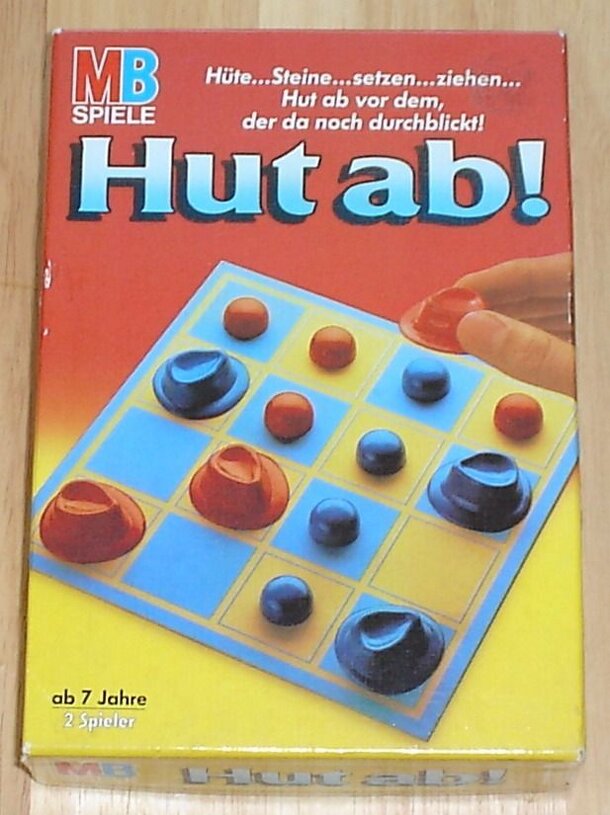 Hut ab! is a small abstract game for two players, and it a bit of a shell game. Players play 5 stones of their color on the 4x4 grid, with the goal to line up four of their color. The players also each have three hats of their color they can use to play onto the board, to cover stones. On a player's turn, they either add a stone or hat to the board, or...