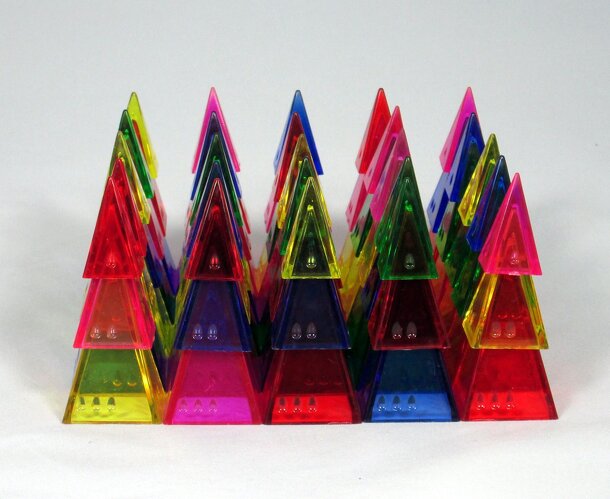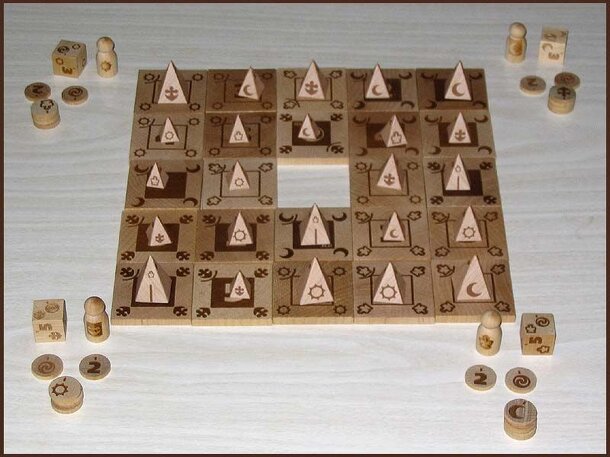 A solitaire games using Icehouse/Treehouse pieces. The original version involved starting with 60 pyramids (4 monochrome Icehouse "stashes") arranged in randomly-colored trees (small on medium on large) in a 5x4 grid. The object to hop pieces to other stacks in the same row or column and end up with monochrome nests (large on medium on small). Score is...