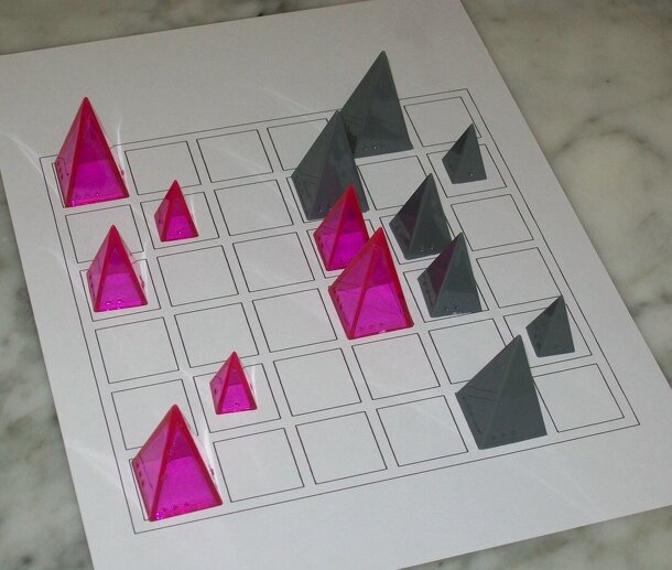 Infiltrate is a quick strategic tussle. In this Icehouse game, two players build 15-point armies, and then try to get one of their units to the enemy's home row first. On each turn, you must move two of your pyramids. Each type of unit has special abilities. Smalls can only move by pushing another pyramid ahead of them. Larges can capture smalls or other...