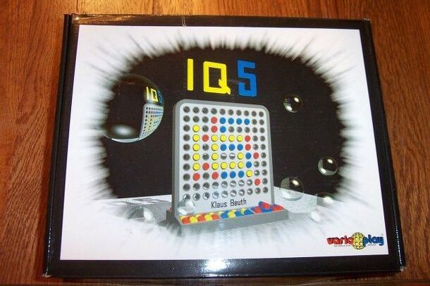 IQ-5 is a clever 5-in-line game where players sit on either side of a vertical grid with holes for pegs. Each player has 10 pegs each in three-color combinations: red/yellow, red/blue, and blue/yellow. Each turn, a player places a peg into one of the grid holes so that one color shows on his side and the other color on his opponent's side. The first player...