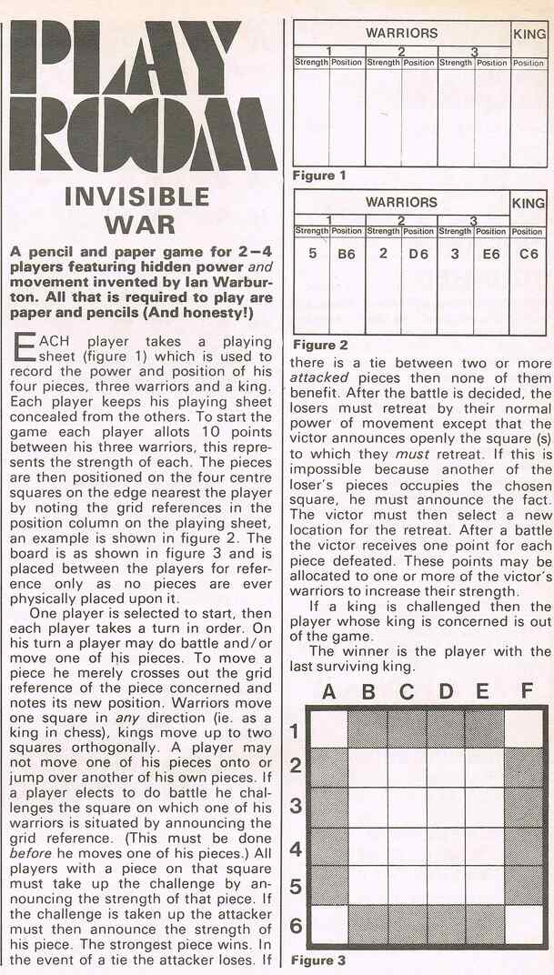 A pencil-and-paper game for up to 4 players. You need a 6 x 6 board to be placed in the centre of play. The board should be noted as A to F horizentally and as 1 to 6 vertically. It is then left in the centre as a quick reference for each player to know where each of their pieces are standing. Each player will have 3 Warriors and 1 King. Each player takes...