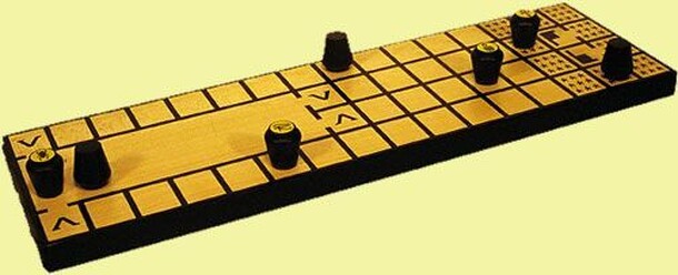 A beautiful solid-wood game that uses a reproduction of an Ancient Egyptian game's components (board and pieces; unfortunately, this game's original ancient rules are lost) and adapts them with thoroughly modern rules. Players maneuver neutral pieces into a position where they can be personalized, and then try to maneuver the personalized piece onto one of...