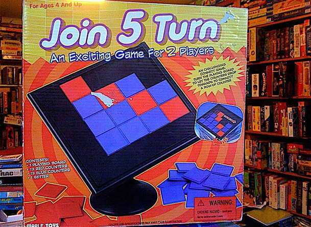 Join 5 Turn is an abstract strategy game for people ages 4 and up. It is basically a new twist on an old game. The old game being Connect Four - or in this case, five. each player has 13 tiles either red or blue and they try to get four or five in a row depending on the variation being played (there are three included with the game) the twist is that the...