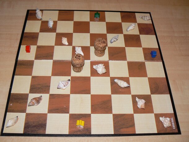 In Joker players move 11 pieces each across a 13x13 board in an attempt to get them all to the start positions on the opposing side (a la Chinese Checkers or similar games). Each piece has 1-4 rings on it which determine how far it can move and/or jump. In addition there are a number of variants - there are Joker pieces which can be used in a way not...