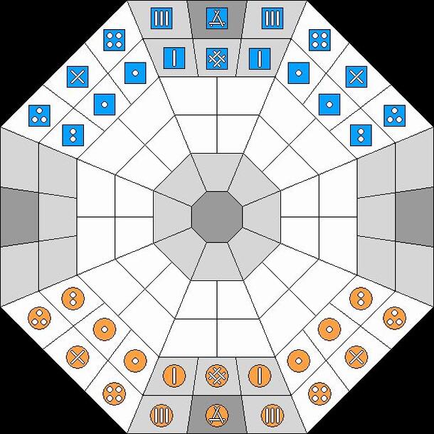 The purpose of the game is to conquer castles on a circular (or octagonal) board. There are 88 fields in five concentric circles around one central field. The central field and four fields in the outer circle are marked with, for example, double borders or a dark colour – these fields are known as castles. Around the castles are fields marked with, for...