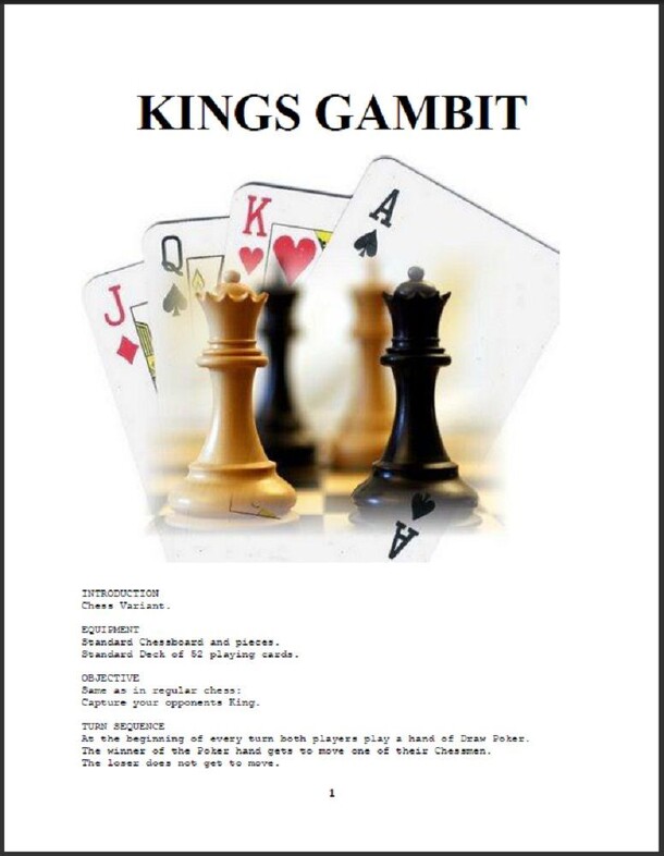 A combination of two classic games! In this Chess/Poker variant, the luck of the draw is as important as skillful chess play. The game is played using a standard chess set and deck of playing cards. All the rules of chess apply except for turn order. Instead of alternating moves between black and white, each turn the players play a hand of Draw Poker. The...