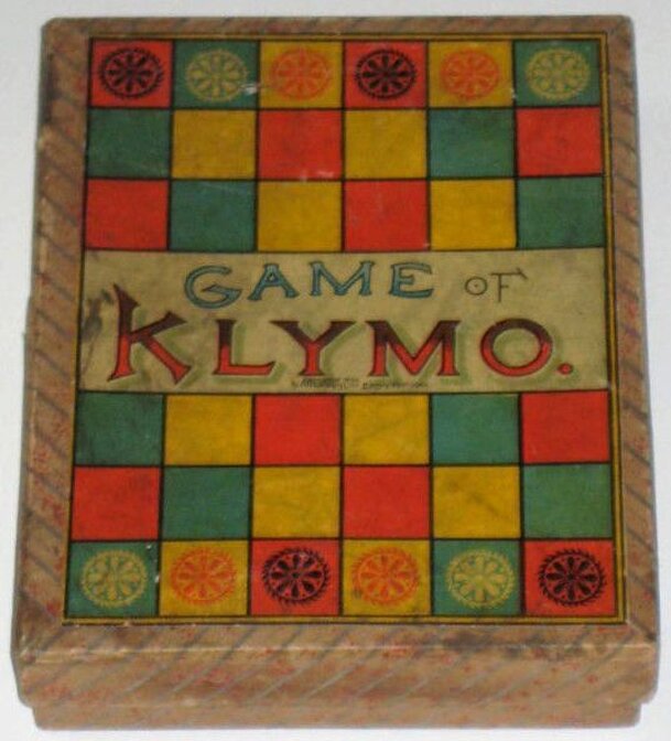 Klymo is played by two to four players, each with his own identical small board and six pieces. The boards are comprised of a 6x6 grid of squares in three alternating colors, with a row of six squares on opposite ends marked. The board is positioned so that one row, the starting row, is closest to each player. Players take turns rolling a six-sided die...