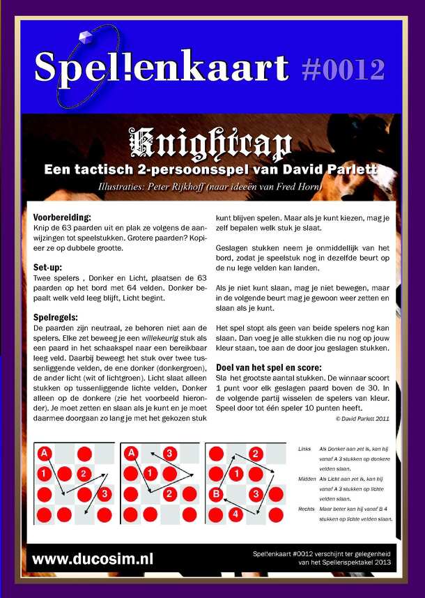 Knightmare Chess adds a whole new element of unpredictability to the static game of standard Chess by giving players cards that they can play before, after, or sometimes instead of their turns. Some cards affect only a single move, while others change the entire game. Multiple variants are included in the rules. The 2014 edition of Knightmare Chess...