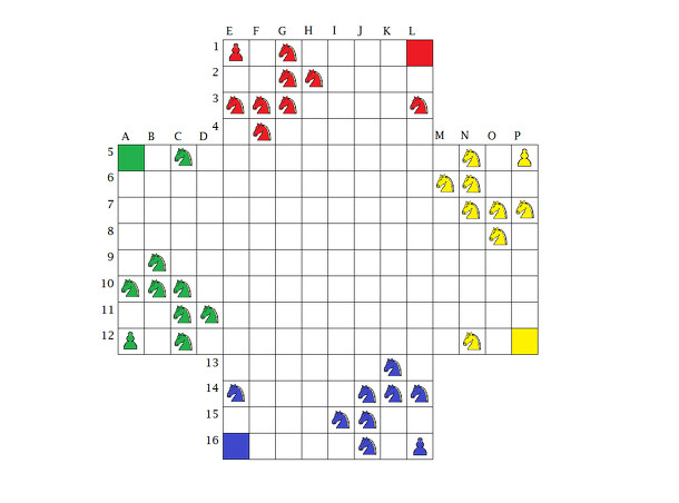 Knights is a Chess-style boardgame for two players, black and white. There are three types of playing pieces: soldiers, knights and one "knight the first", soldiers are pieces dual color like the pieces of Othello. The board is hexagonal and it has triangular spaces. Knights and "Knights the first" are placed on triangular squares, soldiers are placed at...