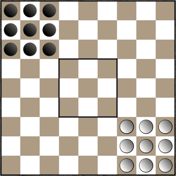 Objective: Be the first moving all of your ten meeples into target positions (two coloured crosses) - moving by turns - Each player chooses a colour placing his/her 10 meeples into starting positions (colour matching corner). During a turn each player moves one own meeple (with a knight's move in Chess). Spaces with other meeples can't be entered, also...