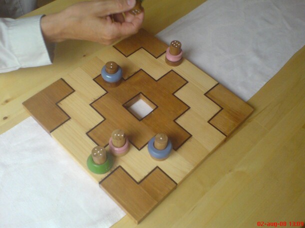 The game contents 24 coloured pieces (12 of each colour) and 6 uncoloured pieces (parallelepipeds “1 x 2 x 3”) and 4 borders to make the frame for the game. Each player takes the pieces of one colour and 3 uncoloured pieces. The aim of the Game is to connect the longest series of pieces of your colour. Uncoloured pieces count as either colour. The players...