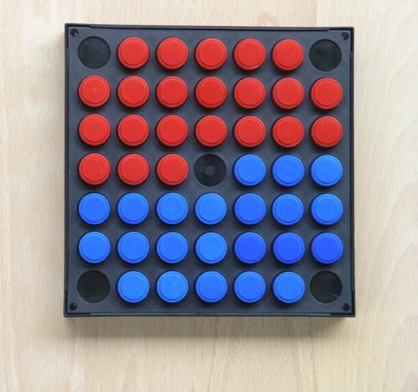 The game was invented by Marino Carpignano in 2016. An 8x8 unchequered game board is used with a certain number of bi-colour counters, white on one side and black on the other, like in Othello. At the beginning, the board is empty. Black moves first. The Black player's first move is obligatorily on one of the 8 squares along the North side of the board....