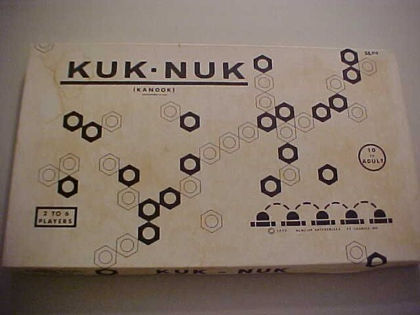 This is a variant of Chinese Checkers, where the "holes" (that contain the marbles) are hex nuts, a colored set for each player. On your turn, you can either move a nut or a marble. Nuts move either one space (on a board that looks uncannily like a standard Chinese Checkers board) or can jump over intervening nuts. It's pronounced "Canook," by the way...