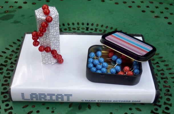 Larue is a tile placement game in which players alternately place triangular tiles on a board such that at least one edge colour matches that of an adjacent tile. The object of the game is to be the first player to have placed all of their tiles. The game comes in brightly coloured box with the (brief) rules printed on the back of the box. Contents are: A...