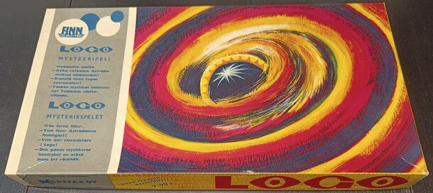 A 2 player game played in the box. Probably early 70s. 12 plastic chips (3 each in red, blue, yellow, and green) are randomly placed in a 3x4 plastic insert. Players take turns placing 1 of the 6 domino-like tiles (each of which contains two of the colors). Each placement of a remaining tile must cover the two matching colors. The player who places the...