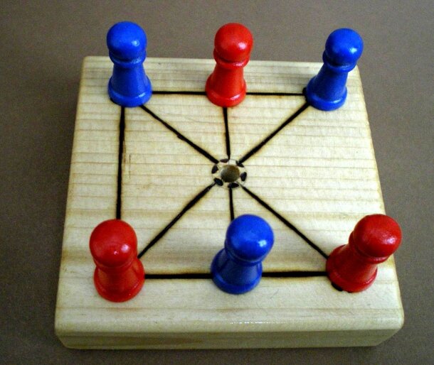 Madelinette is a small, simple game of blockade, probably invented by J & J Loader for their book, Making Board, Peg and Dice Games. There seems to be no reference to this game before the publishing of this book. Two players strive on a board of seven points, each with three pieces, to block in their opponent's pieces so that the opponent cannot move....