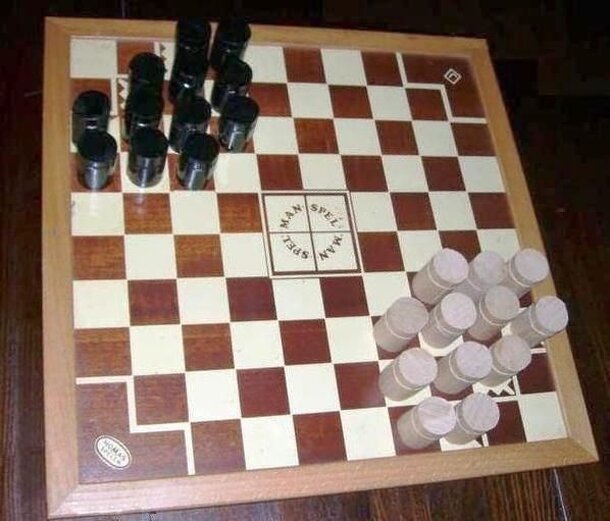 Manspel is a two player game with fairly simple rules. Each player starts with 12 pieces (men) arranged in opposite corners of the board. The object is to occupy the corner-field of the opponent with one of your own men. Pawns of the opponent are caught by jumping, like in checkers. Certain fields in the corners in the middle of the board may be jumped...