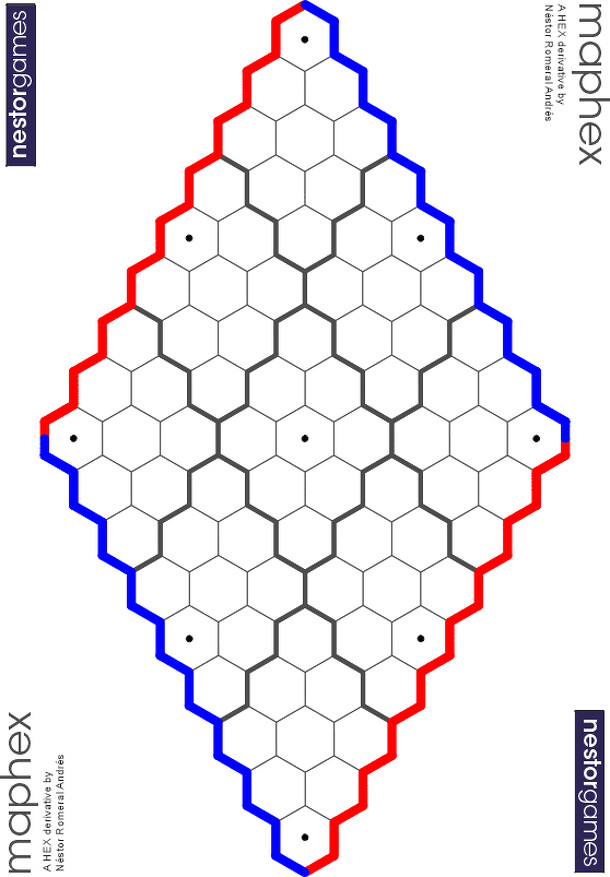 Maphex is a derivative of the masterpiece HEX (Piet Hein 1940) where your opponent's move determines which sub-board you can play on (mechanism from Ultimate Tic-Tac-Toe). MATERIAL 9x9 HEX board composed of 3x3 sub-boards. 41 red counters and 41 blue counters Maphex can also be played on a 16x16 board, that also seems more balanced. PREPARATION Place the...