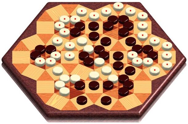 A two-player connection game with capture, played on a special tiling. Board: The Marque board is a tessellation of triangles and squares, similar to the semi-regular 3.4.6.4 tiling but with the hexagons subdivided into triangles (the seven subdivided hexagons are called bases). This gives a total of 96 cells: 66 triangles and 30 squares. Start: The board...