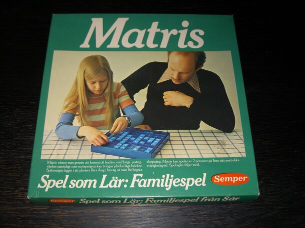 A simple abstract game played on a 5x5 board (minus the corners.) The board has a 3x3 area in the middle with the numbers 1 through 9, plus 3 blank spaces adjoining each side of the board. The object of the game is to reach all 9 numbers by creating 'matrixes'. Each player has 2 pieces which are placed one at a time on the bank spaces on the outside edge...
