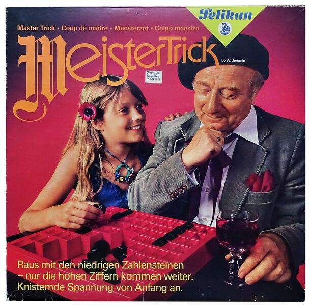 Meistertrick is a game in which two players try to outsmart each other in a game of numbers. Each player arranges blocks numbered 1 to 8 on their side of the game tray, keeping the arrangement hidden from the opponent. Both sides then reveal their blocks; the lower number of each pair of opposing blocks in a row is discarded. The next round continues with...