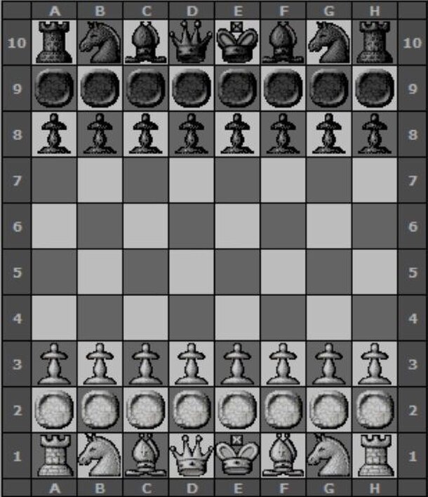 Men Row Chess is a variant of Chess that combines Chess and Checkers. Men Row Chess is played on an 8x10 board. Both players have 8 checkers (men) in addition to the common chess pieces. The goal of Men Row Chess is different from the goal of the common Chess: a player wins by capturing the opponent's king or stalemating the opponent. All chess pieces move...